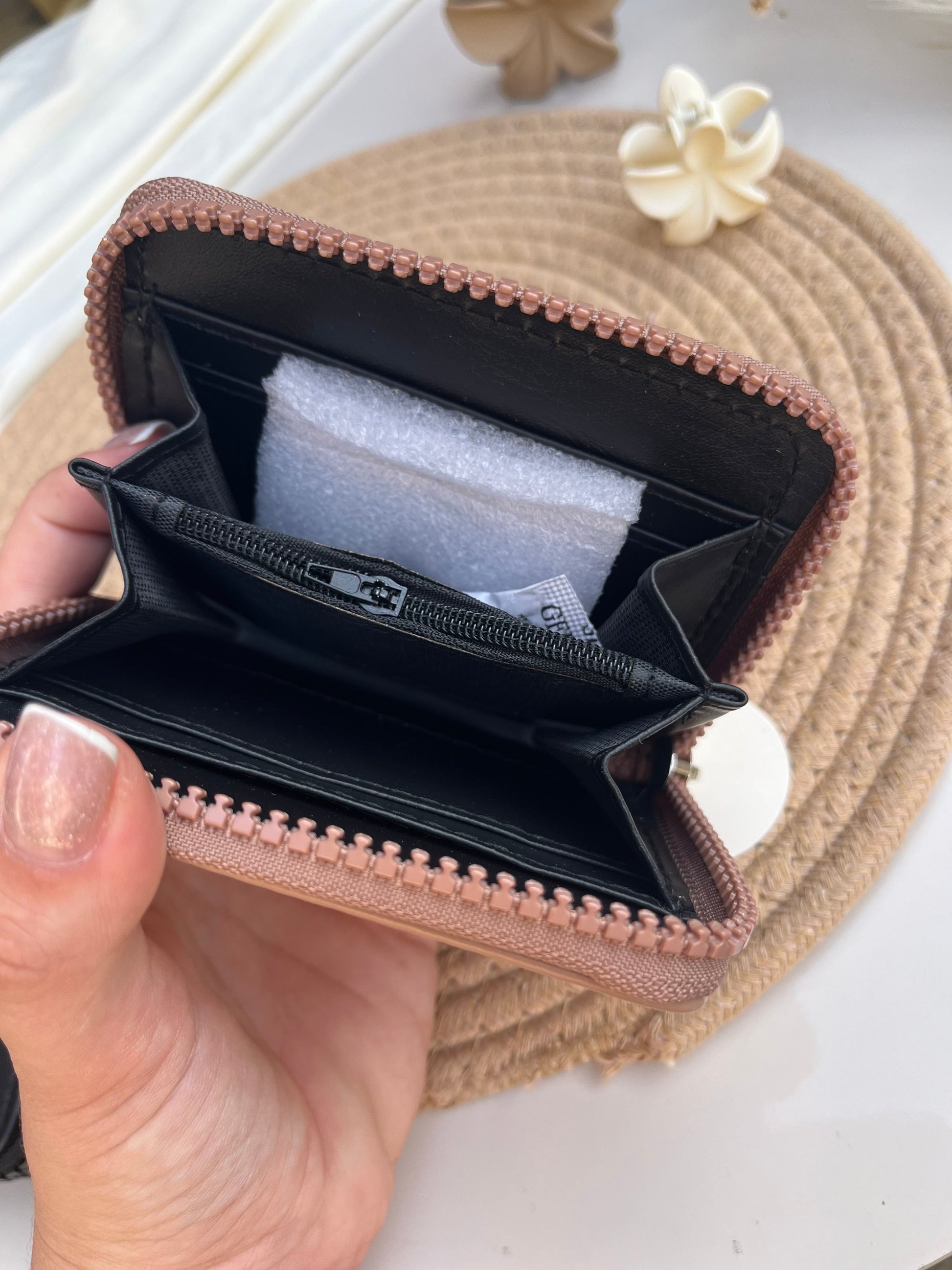 •Interior con espacio para tarjetas, monedas y billetes.