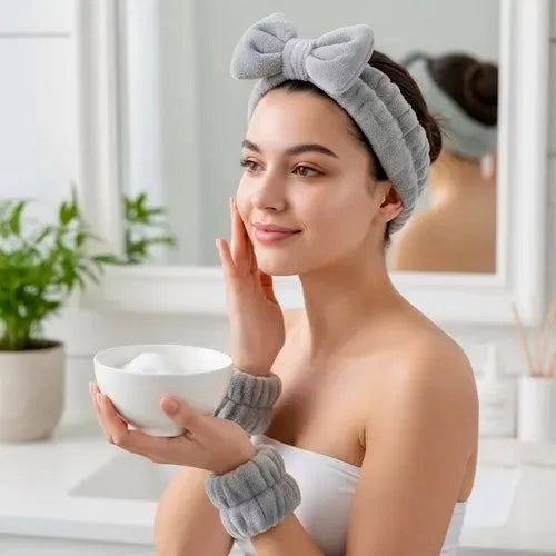 Set de vincha y muñequeras ideal para skincare y maquillaje. Ayuda a mantener el cabello y las manos secas durante tu rutina, aportando comodidad y practicidad. Suaves, funcionales y perfectas para el uso diario 💄🧖♀️